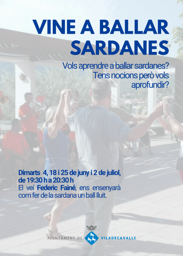 Vols aprendre a ballar sardanes? ORGANTIZA L’AJUNTAMENT DE VILADECAVALLS. CURS TOTALMENT GRATUÏT A càrrec de Federic Fainé Data: 4, 18 i 25 de juny i 2 de juliol Hora: 19:30 a 20:30 h Durada: 1 hora Públic: Tots els públics…