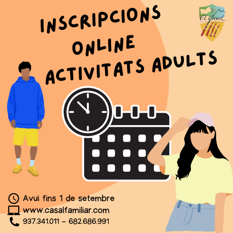 2023 PREINSCRIPCIÓ ACTIVITATS ADULTS Per fer la inscripció a qualsevol de les nostres activitats per adults, a partir del 28 d’agost es faran totes les gestions a la secretaria del Casal Familiar de Viladecavalls. Carrer Antoni Soler i Hospital, 2, Viladecavalls (08232)