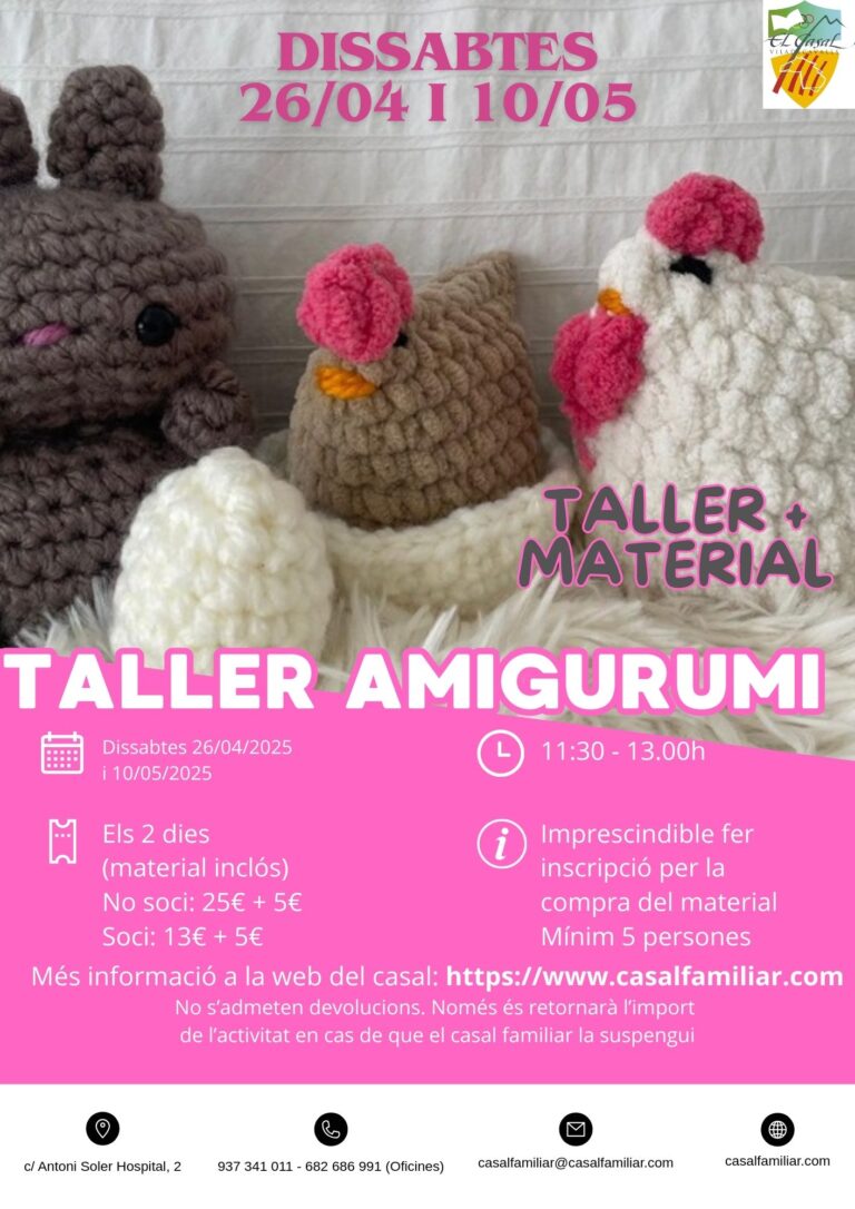 Nom activitat: TALLER AMIGURUMI Nom del/la professor/a: Vanesa Benvinguts/des,Els dissabtes 26 d’Abril i 10 de Maig tenim un nou taller!! En el taller d’amigurumi, els participants tindran l’oportunitat de submergir-se en el meravellós món del crochet i la creació de…